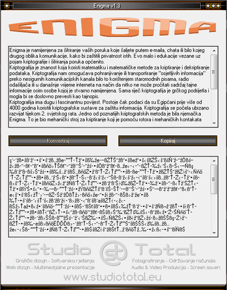Enigma služi za kriptiranje (šifriranje teksta) kojeg šaljete putem e-maila, chata ili bilo kojeg drugog oblika komunikacije, kako bi zaštitili privatnost istog.